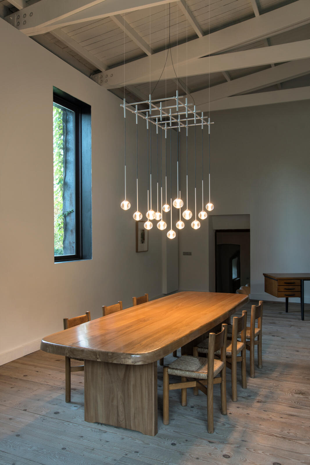 Pendant light fitting designed by Toan Nguyen. Composed of a collection of hand blown glass spheres with LED light source suspended at different heights, anchored to the ceiling via a floating tubular structure. Available with ceiling rose or built-in. The finishes are matt graphite and matt white.