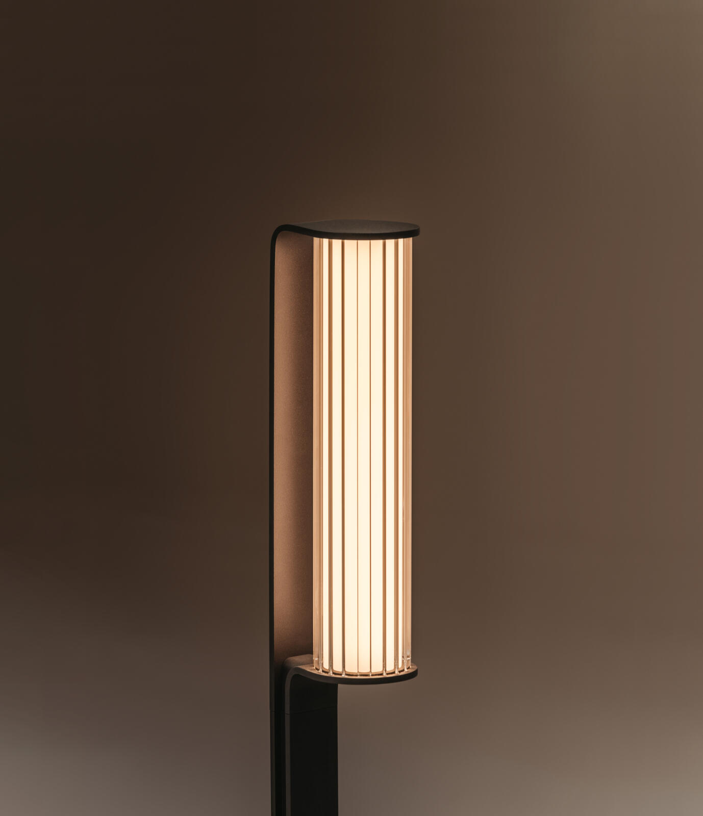 Class is an outdoor pillar lantern in which matter and light come together in a single body. The matt black of the lamp's stem contrasts with the fluted surface of the glass cylinder. The light bathes a wide area of outdoor space.