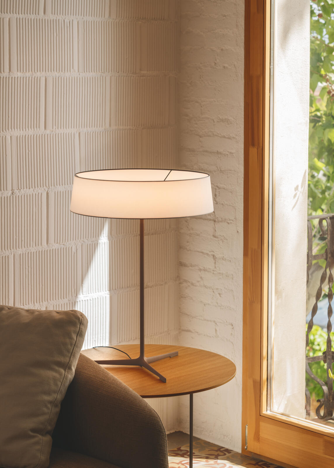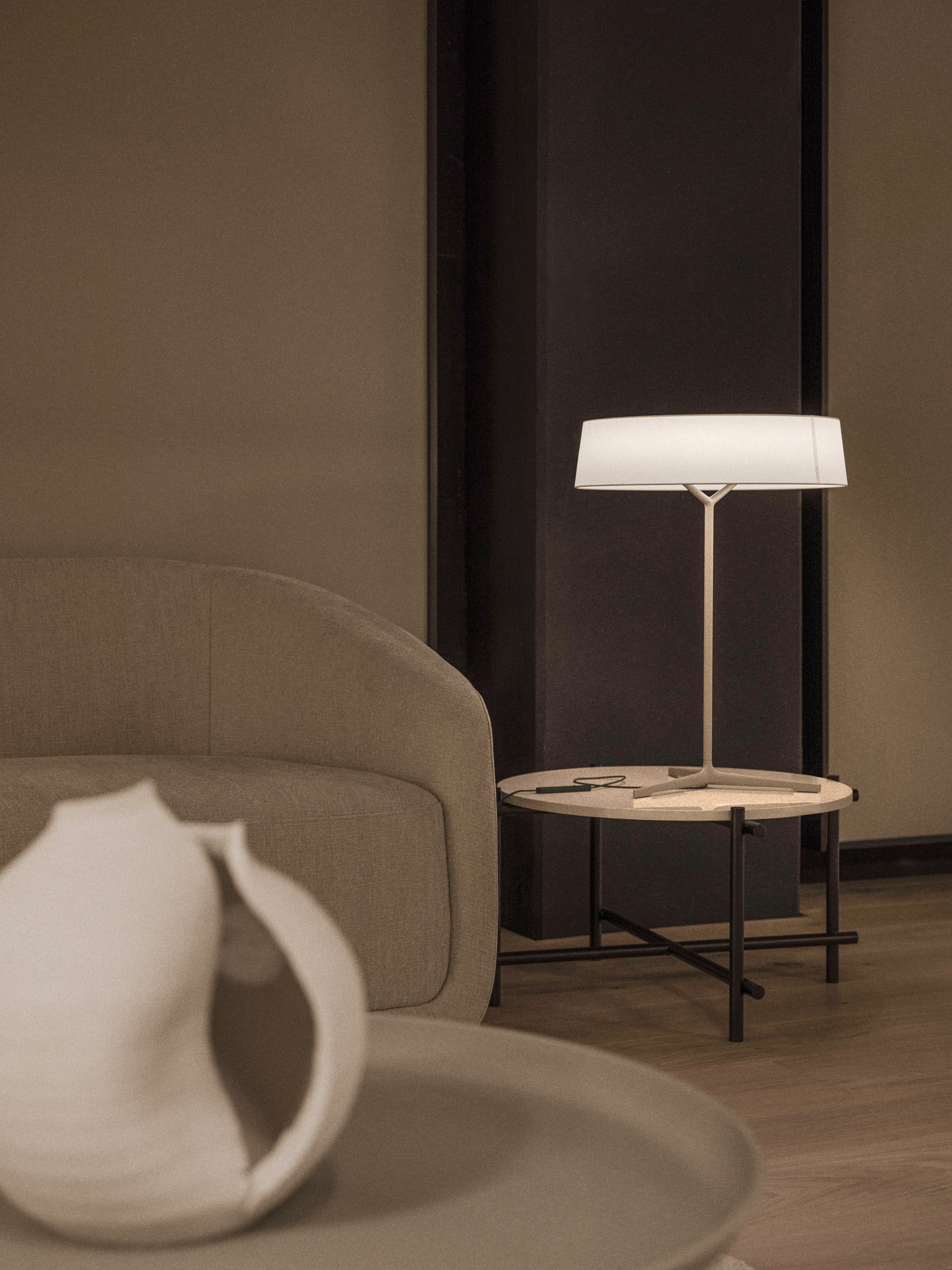 The Dama table lamp pays tribute to classical lamps. Characterised by a delicate aluminium structure bordering a cylindrical shade, it creates a sense of weightlessness.