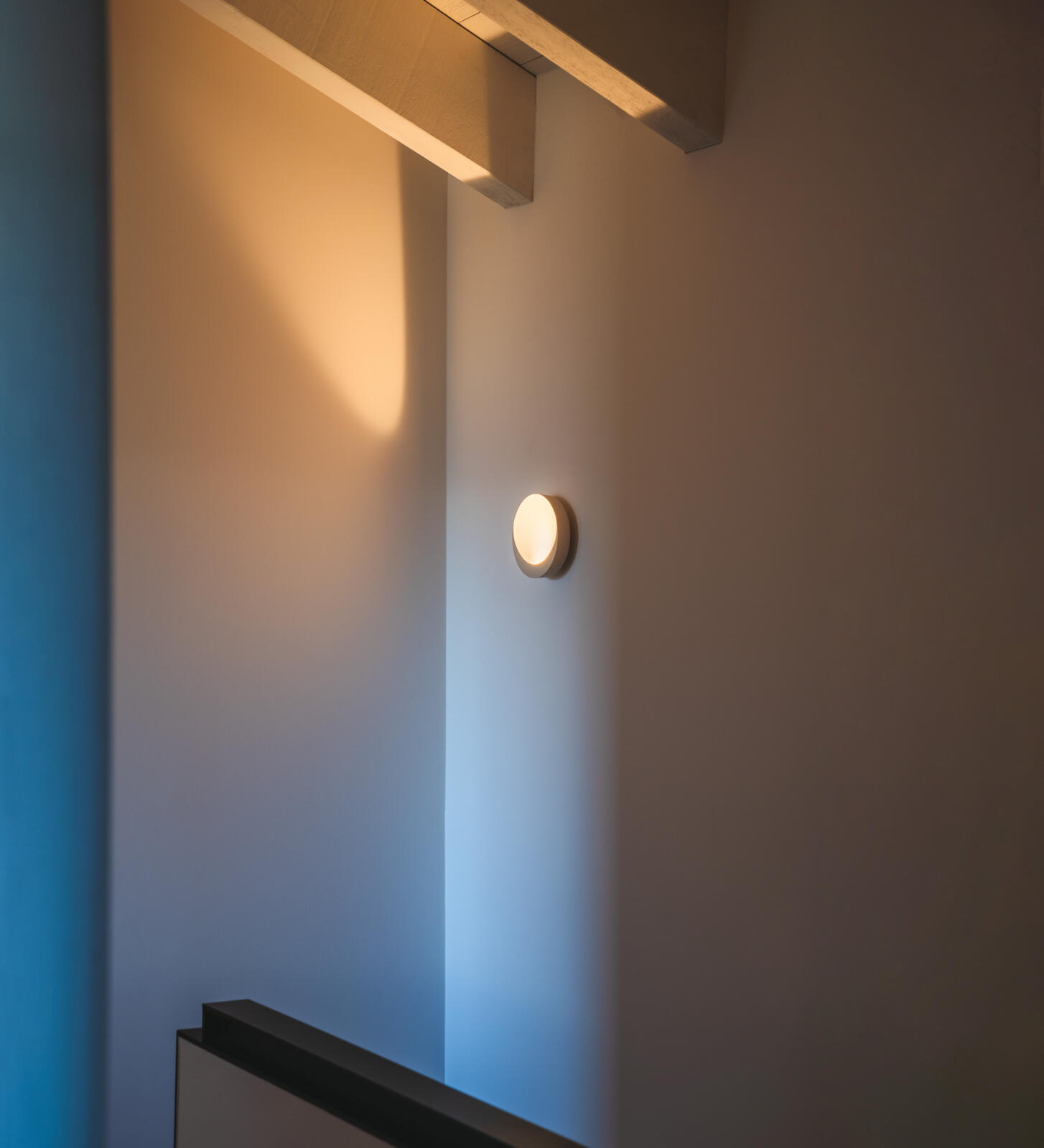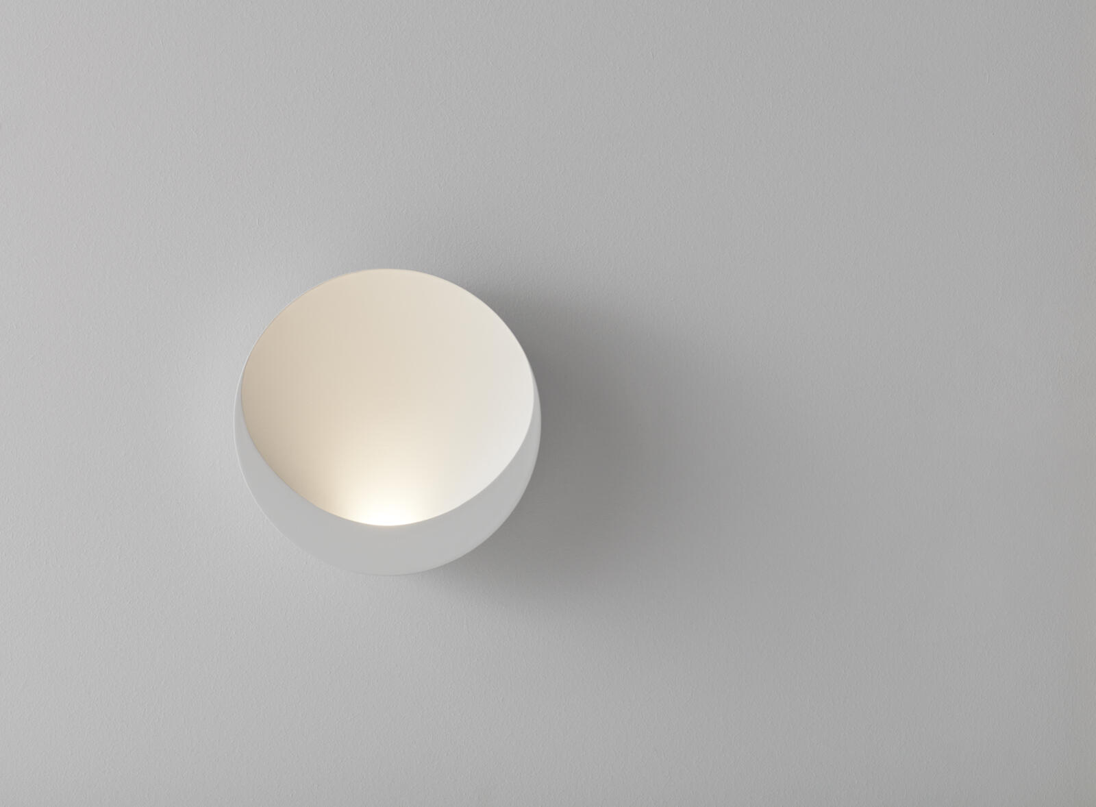 The Dots indirect lamp is a compact, circular wall sconce that offers diffuse lighting effects. The luminaire features a concave form that reflects light off its lacquered surface like the glow of the moon at night. Available in four lacquered Chromatica colours.
