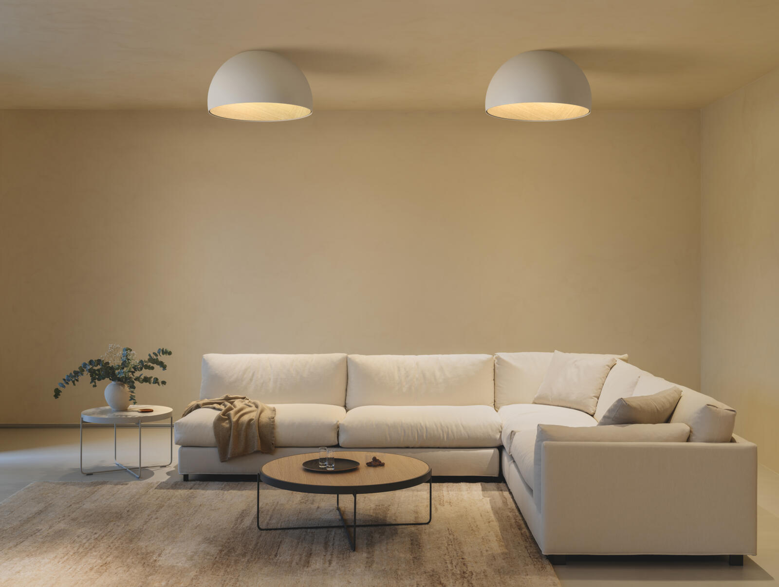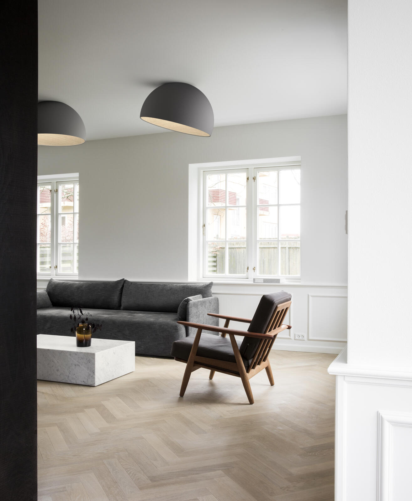 Duo is a ceiling light with surface installation where the natural warm appearance of the oak wood on the inside is combined with the technical refinement of the aluminium metal wrap on the outside.