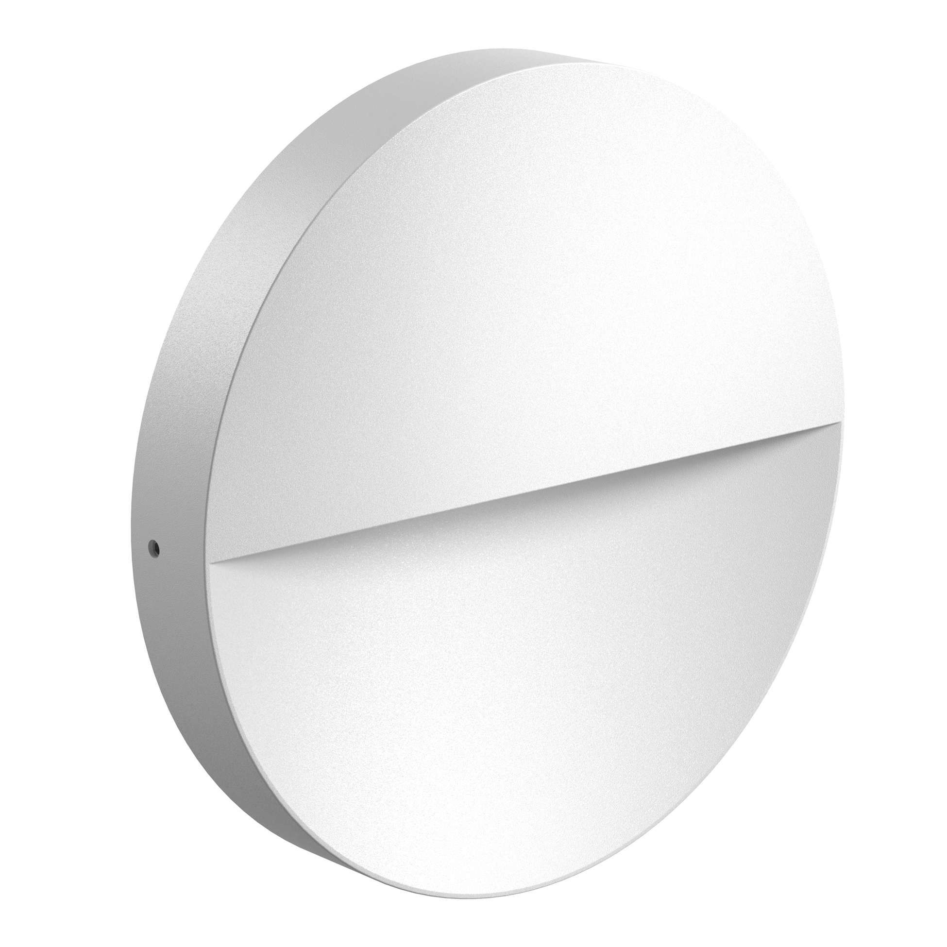 Round, access indicator luminaire with reduced thickness, for wall installation. Transparent polycarbonate diffuser.