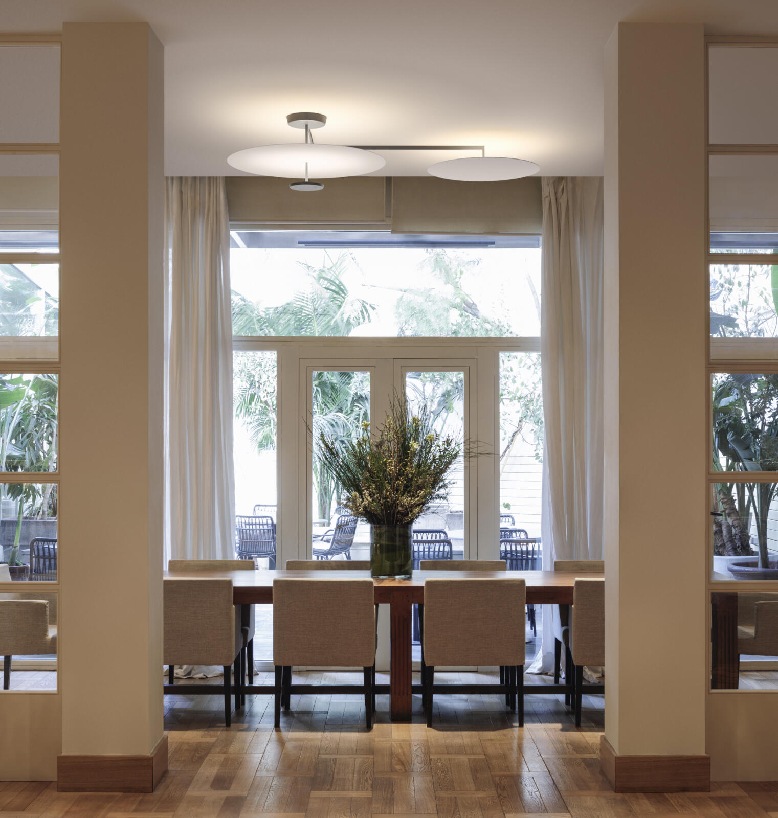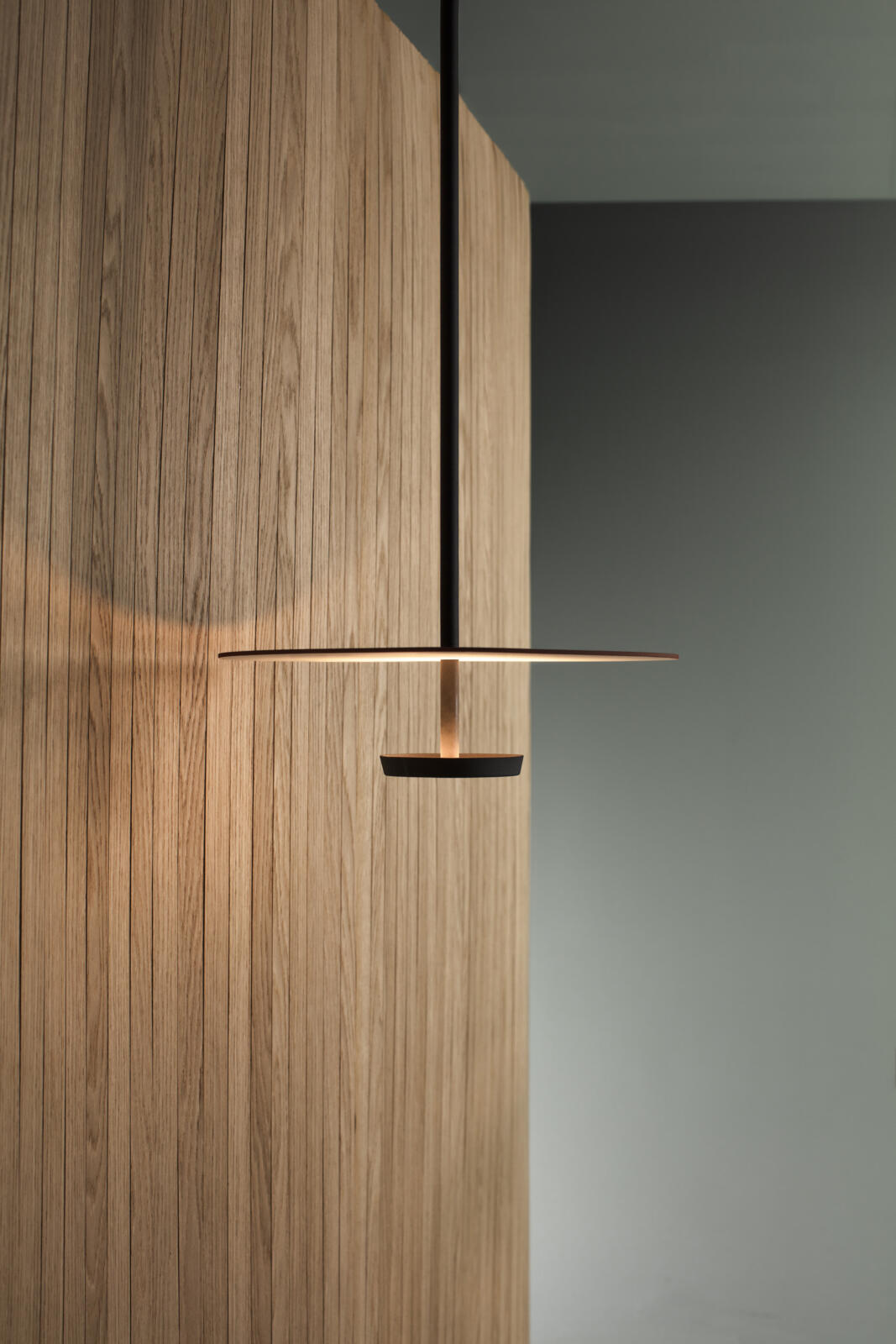 Flat is a ceiling lamp composed of horizontal discs at various heights that create planes of reflected light. The Flat ceiling light has a strong graphic quality, combining structure and functionality.