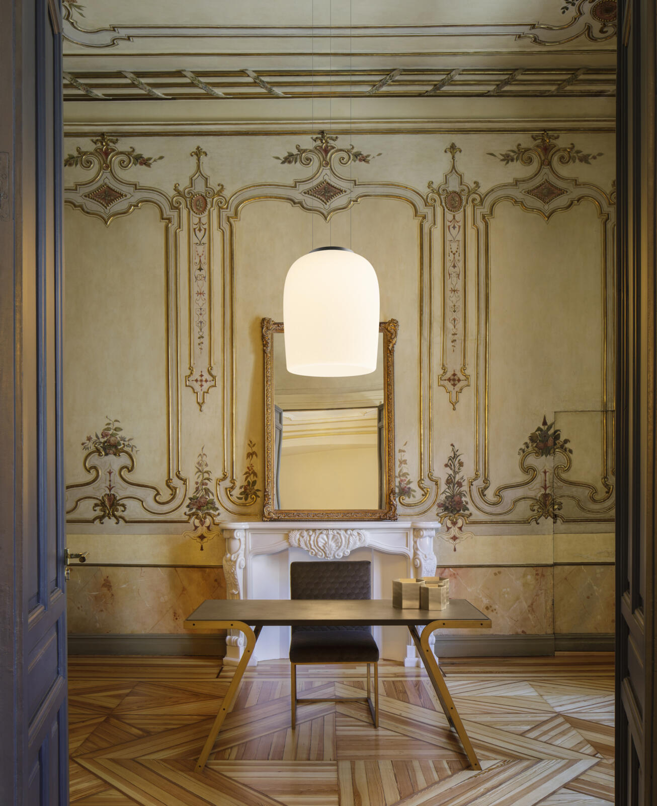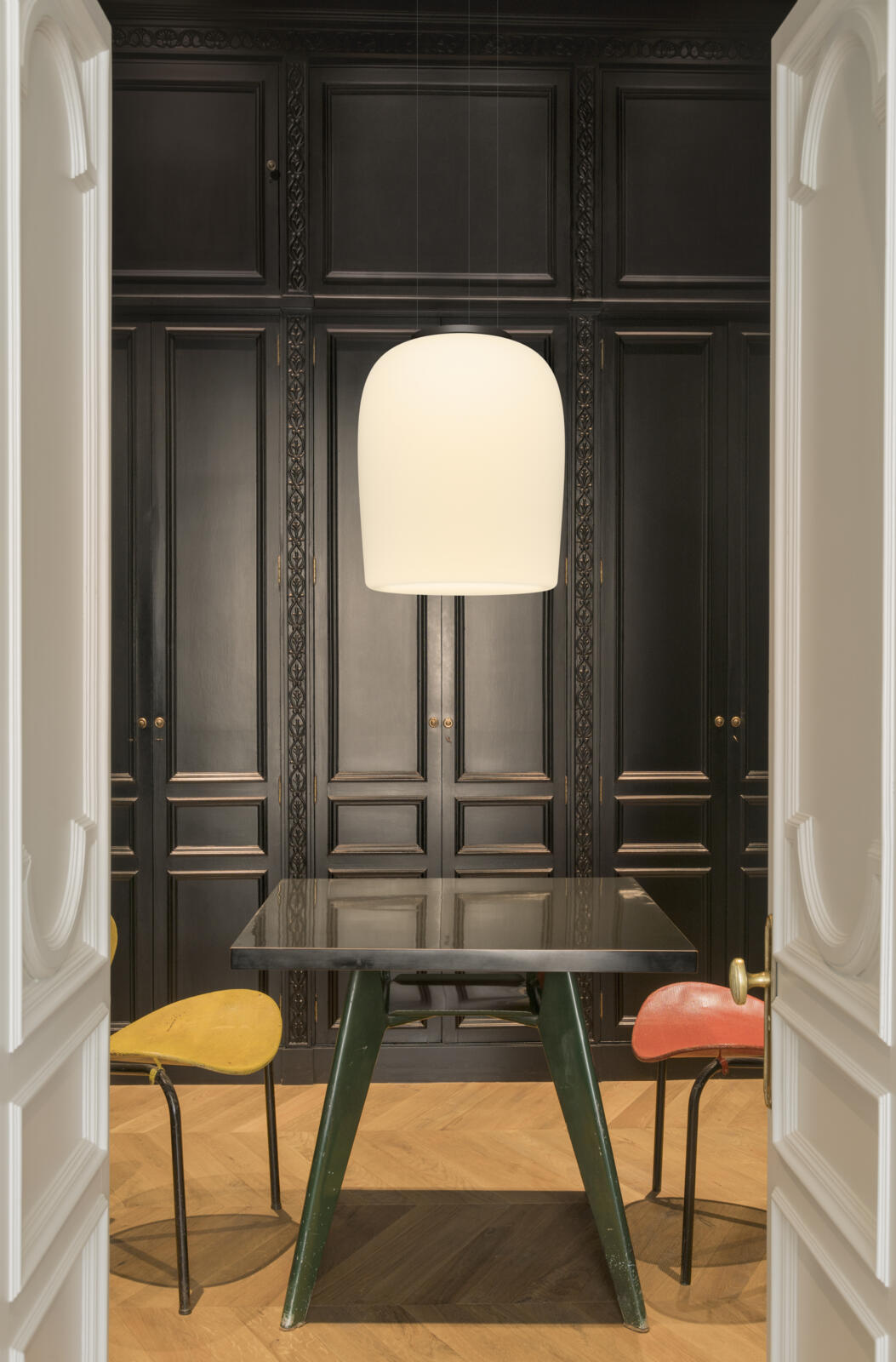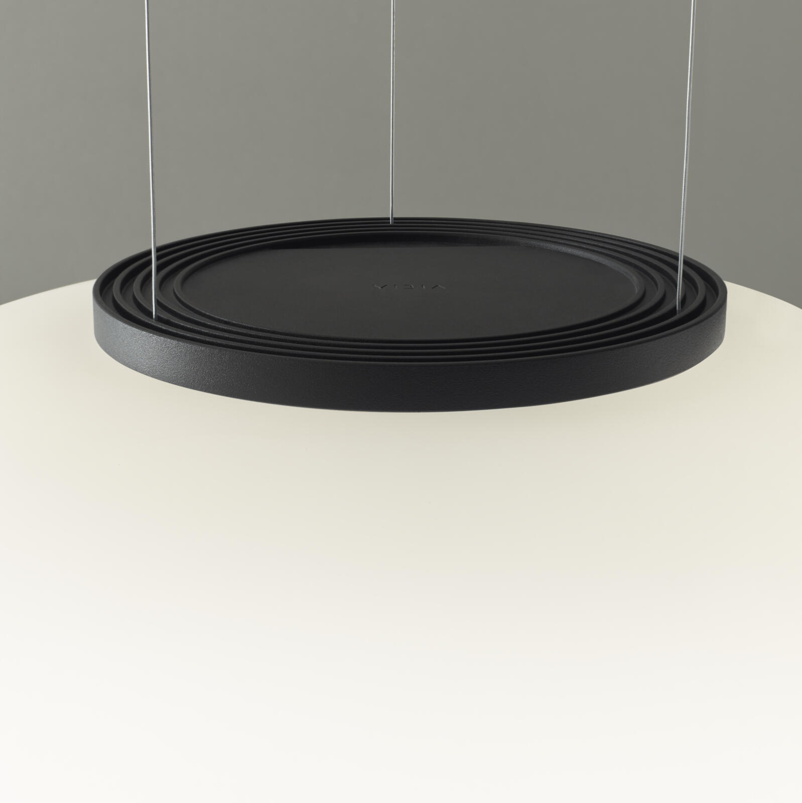 Both dramatic and delicate, the Ghost pendant hangs low from nearly invisible cables to form a floating focal point. Crafted of mouthblown opal triplex glass, its smooth surface radiates a warm, luminous glow.