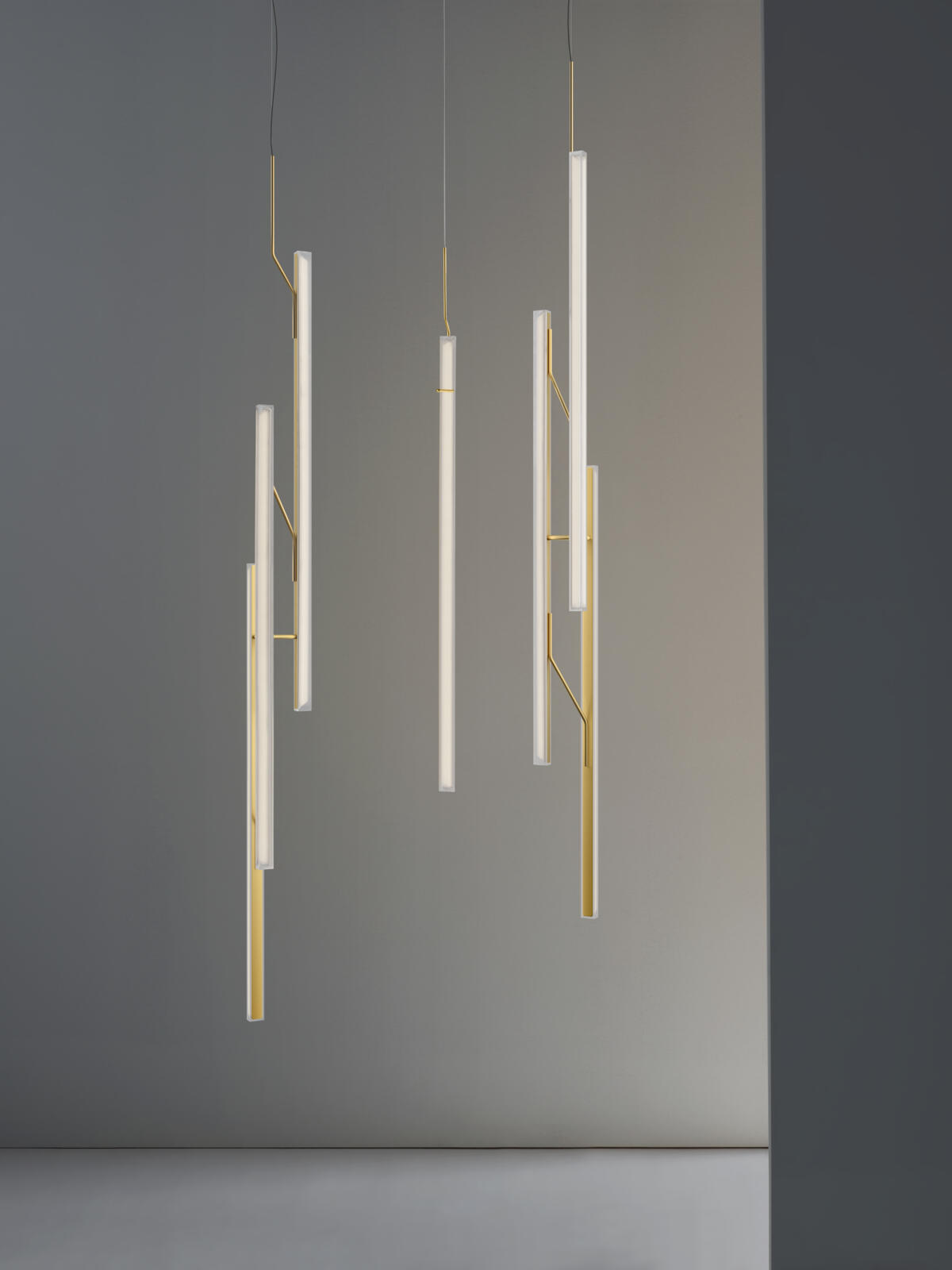 Hanging lamp. Providing an ambient or indirect light through its vertical methacrylate diffuser. The diffuser is supported by a fine grade steel structure. By combining several units of differing heights a more dynamic effect can be achieved for larger spaces.