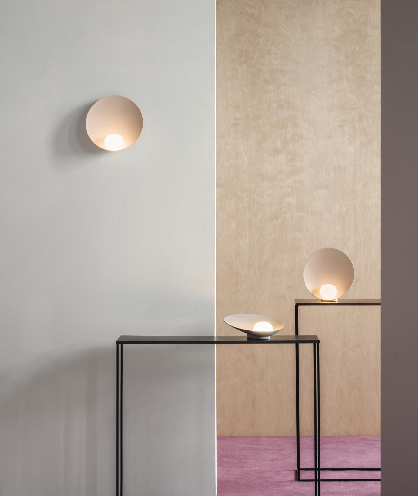 Vibia offers a table lamp. The aluminum base captures the light as the small glass sphere and transforms it into a soft illumination.