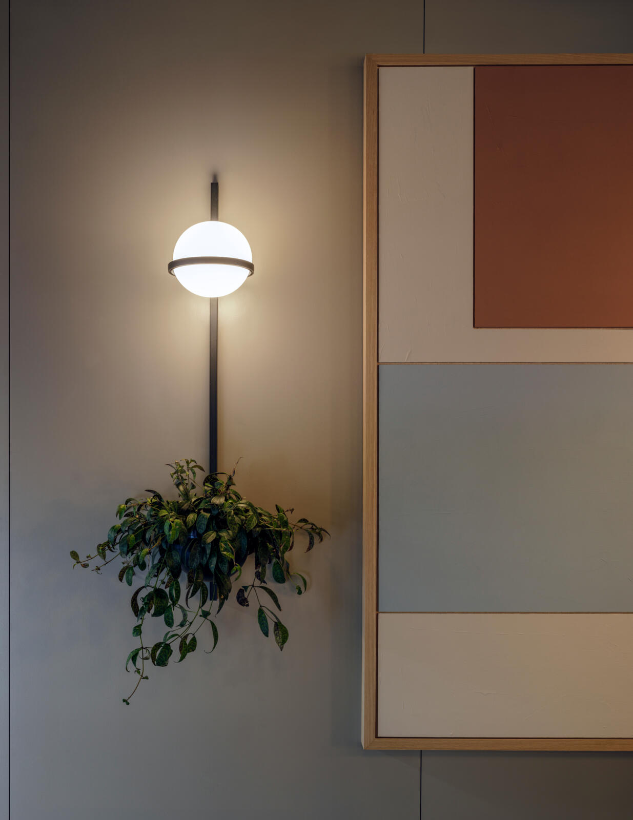Vibia presents a horizontal wall lamp. It is expressed in a different way to the classical globe, new vertical relationships at a large scale combined with vegetation.