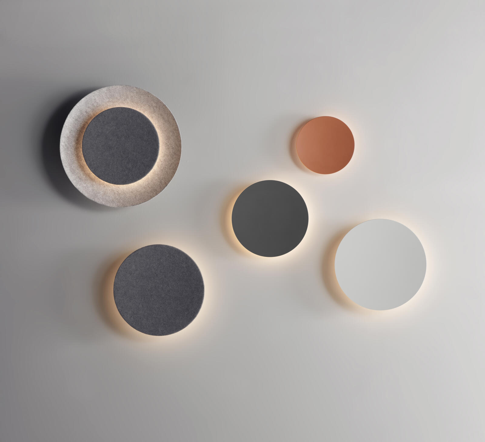 Wall sconce featuring two superimposed discs. Lightly concave in form with different diameters, the larger contains the smaller one physically as well as luminously while diffusing the light emitted.