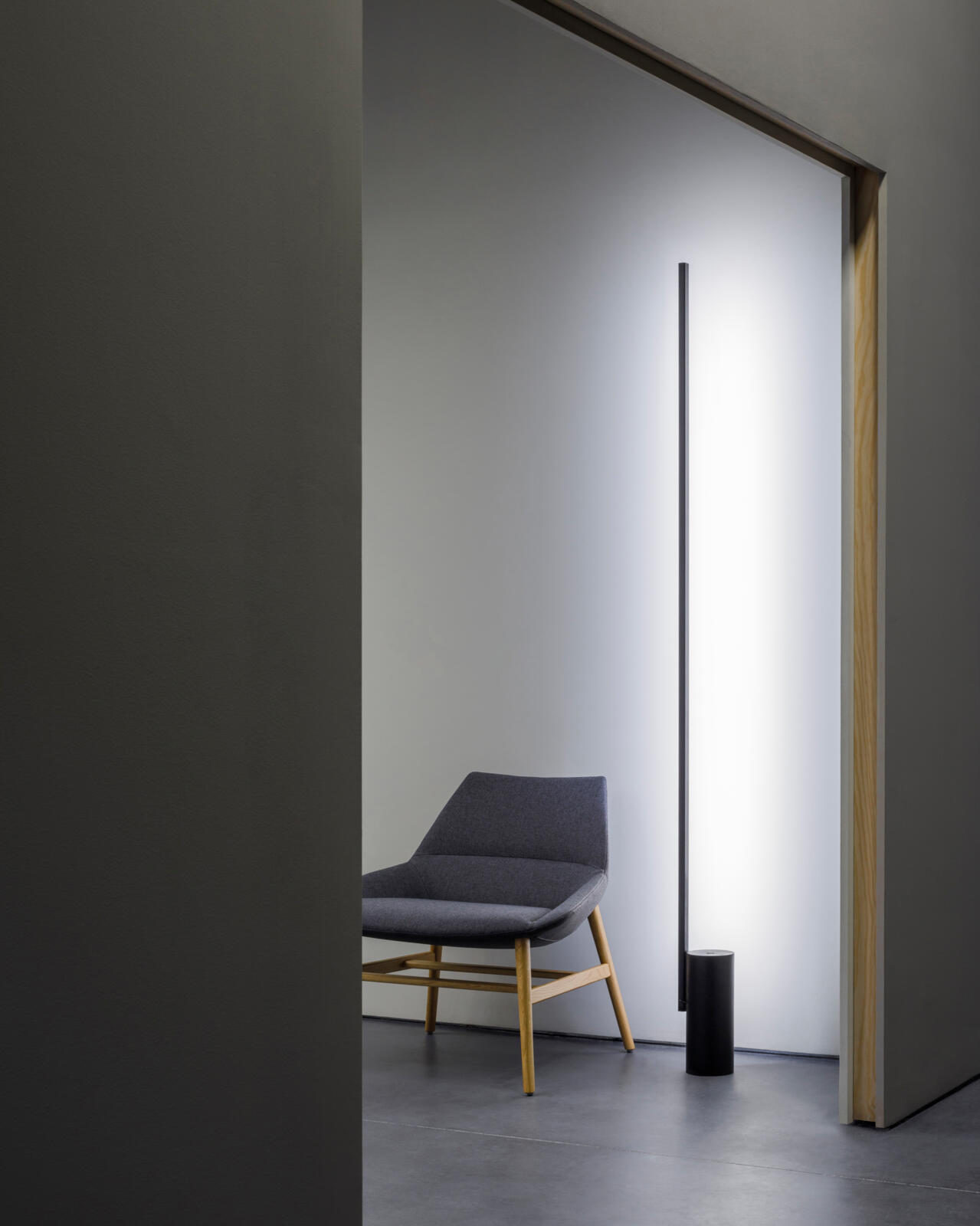 The Sticks Solo floor lamp connects two planes within the same space. Providing a pleasant ambient lighting or indirect light depending on the rotation of the rod. The horizontal rod provides a low glare illumination.