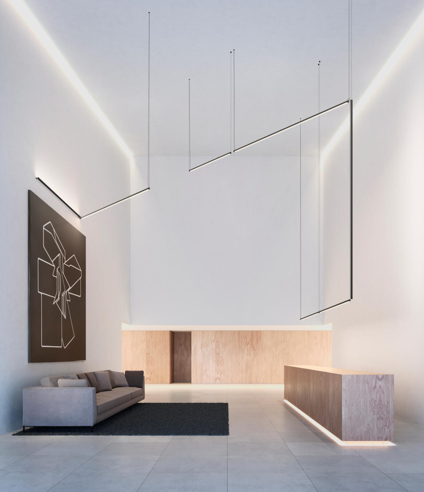 The hanging Sticks Solo light incorporates a range of electrical connection options for seamless integration with surrounding architecture. It provides a low glare illumination.