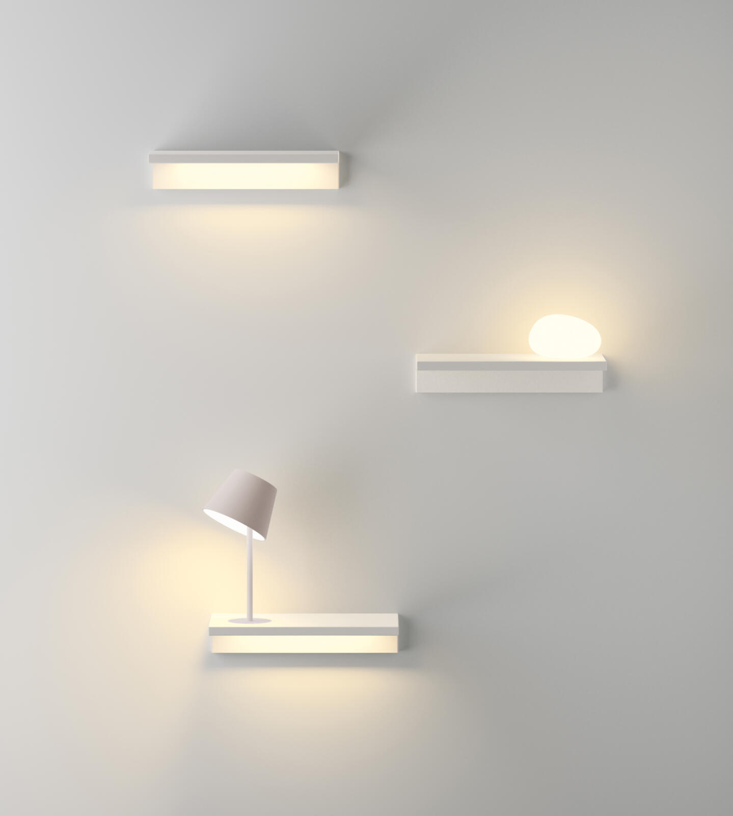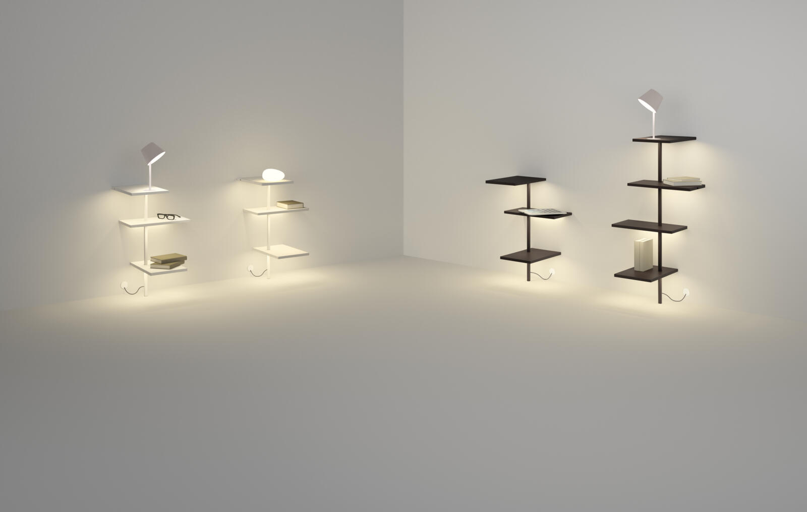 Suite is a floor lamp that boasts different functions, where matter and light are integrated in a single body. Suite boasts different stands, as well as LED lighting and a USB charging station. Designed by Jordi Vilardell & Meritxell Vidal. Available in two finishes: dark brown and white.