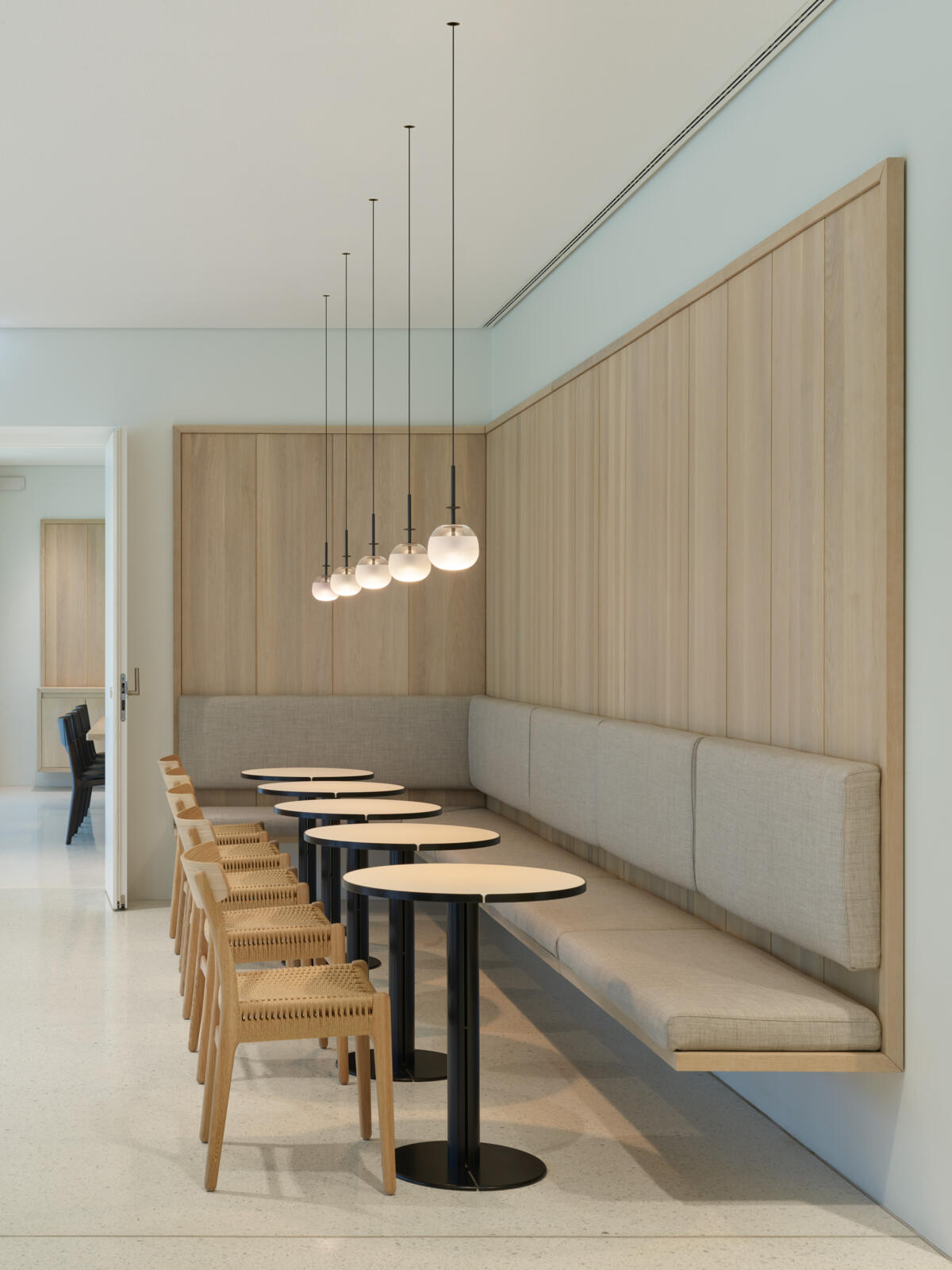 Tempo pendant lamps are a design by Lievore Altherr. Suspended from the cable, the blown glass diffuser offers subtle nuances of transparency and translucency. All models of the Tempo collection incorporate LED lighting.