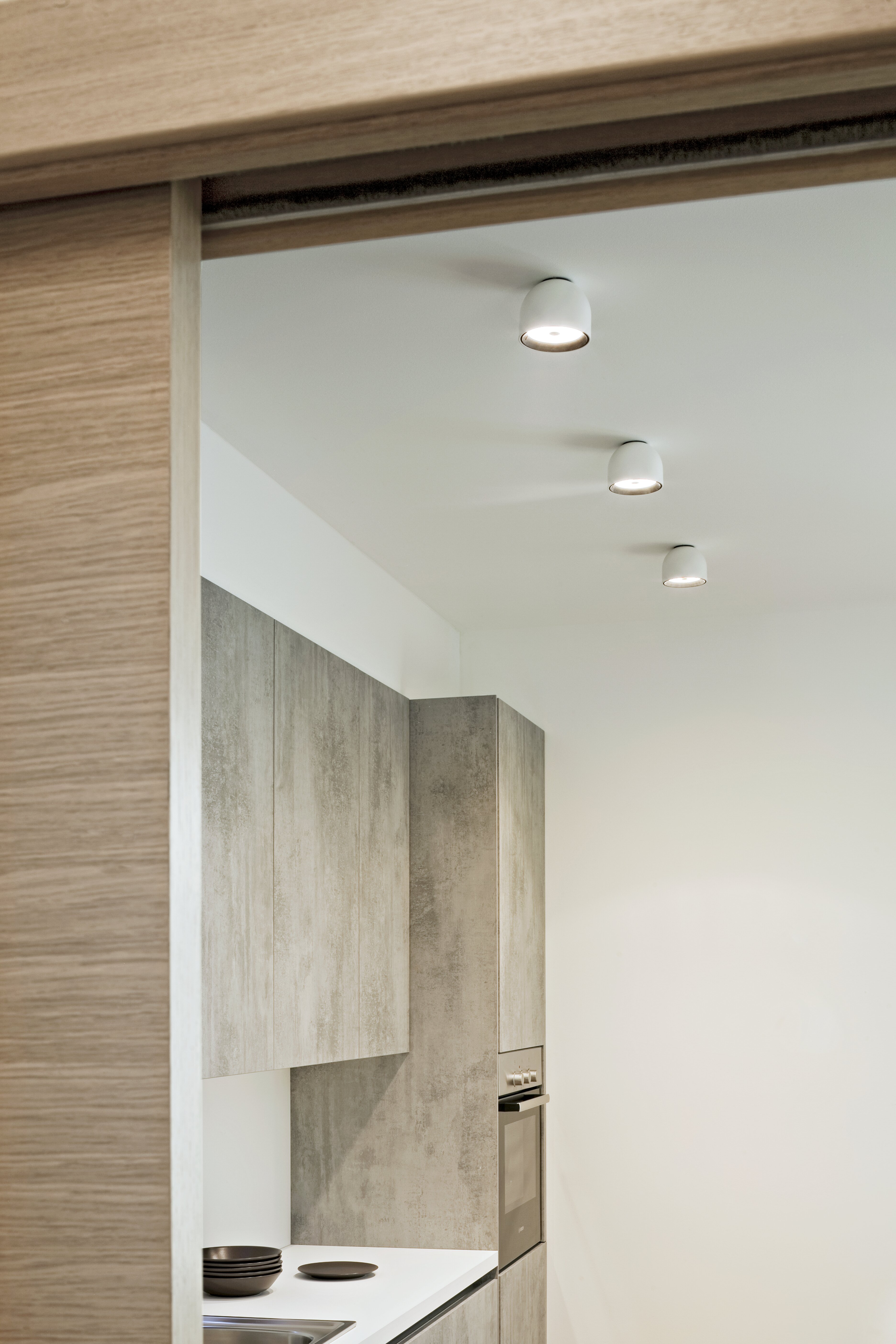 Wall or ceiling fixture providing direct lighting. Aluminum body, available in shiny white and shiny black finishes. Low glare shield. Provided by two different ring due to block the safety tempered glass, in black and green.